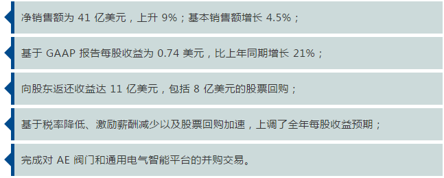 艾默生公布截至2018年12月31日的公司第一季度的財務業績。其中,凈銷售額增長9%,基本銷售額增長4.5%,貨幣折算帶來1.5%的消極影響以及業務并購帶來6%的積極影響。